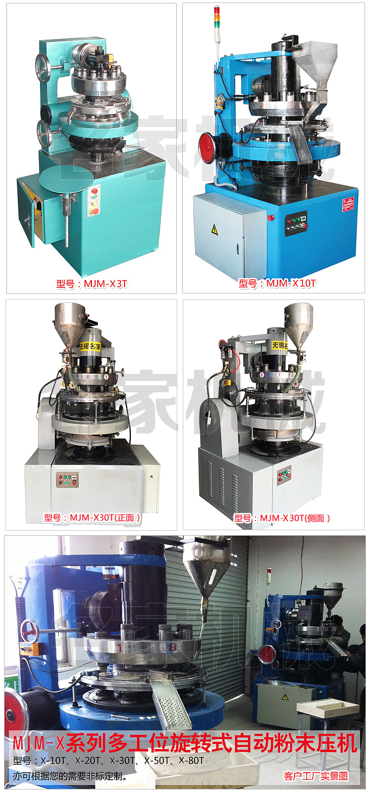 MJM-X系列多工位旋轉(zhuǎn)式自動(dòng)粉末壓機(jī)---特點(diǎn)與功能: ★多工位配備,產(chǎn)量大、生產(chǎn)效率高、自動(dòng)化程度高 MJM-X系列多工位旋轉(zhuǎn)式自動(dòng)粉末壓機(jī)---適用范圍: 適用于壓制圓柱型、方型、半月型、段差型、日字型、多孔型、薄片型、U型等簡(jiǎn)單形狀的粉末成型制品。 MJM-X系列多工位旋轉(zhuǎn)式自動(dòng)粉末壓機(jī)---技術(shù)參數(shù):